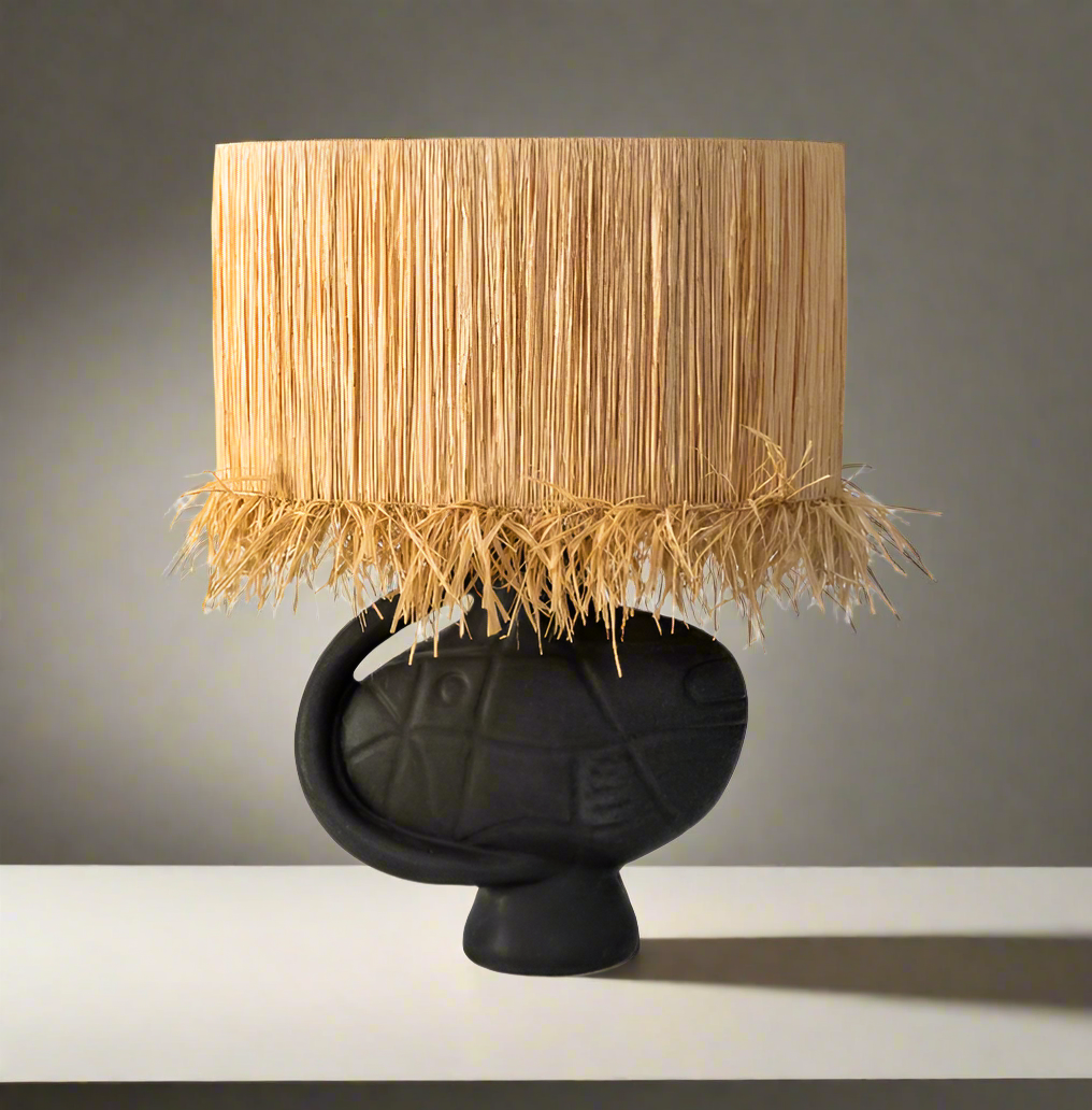 Ceramic sculptural lamp in matte black with raffia lamp shade.