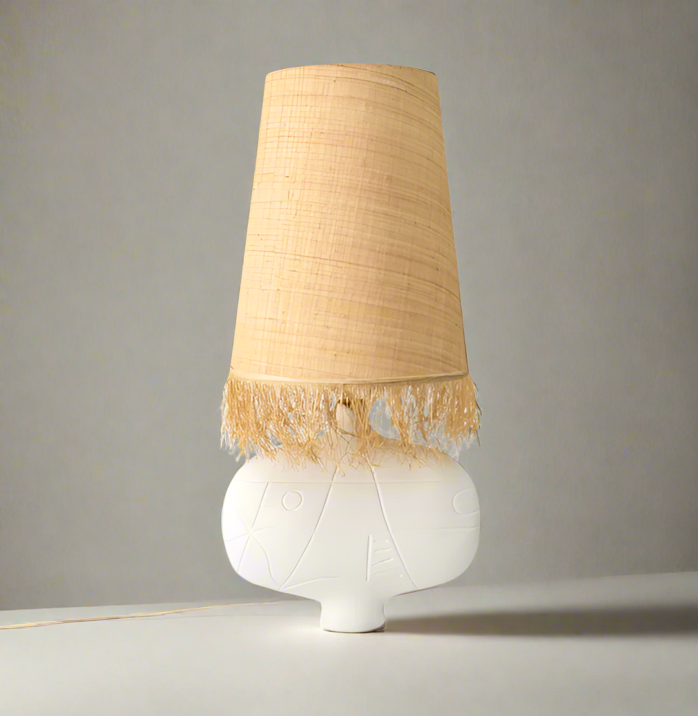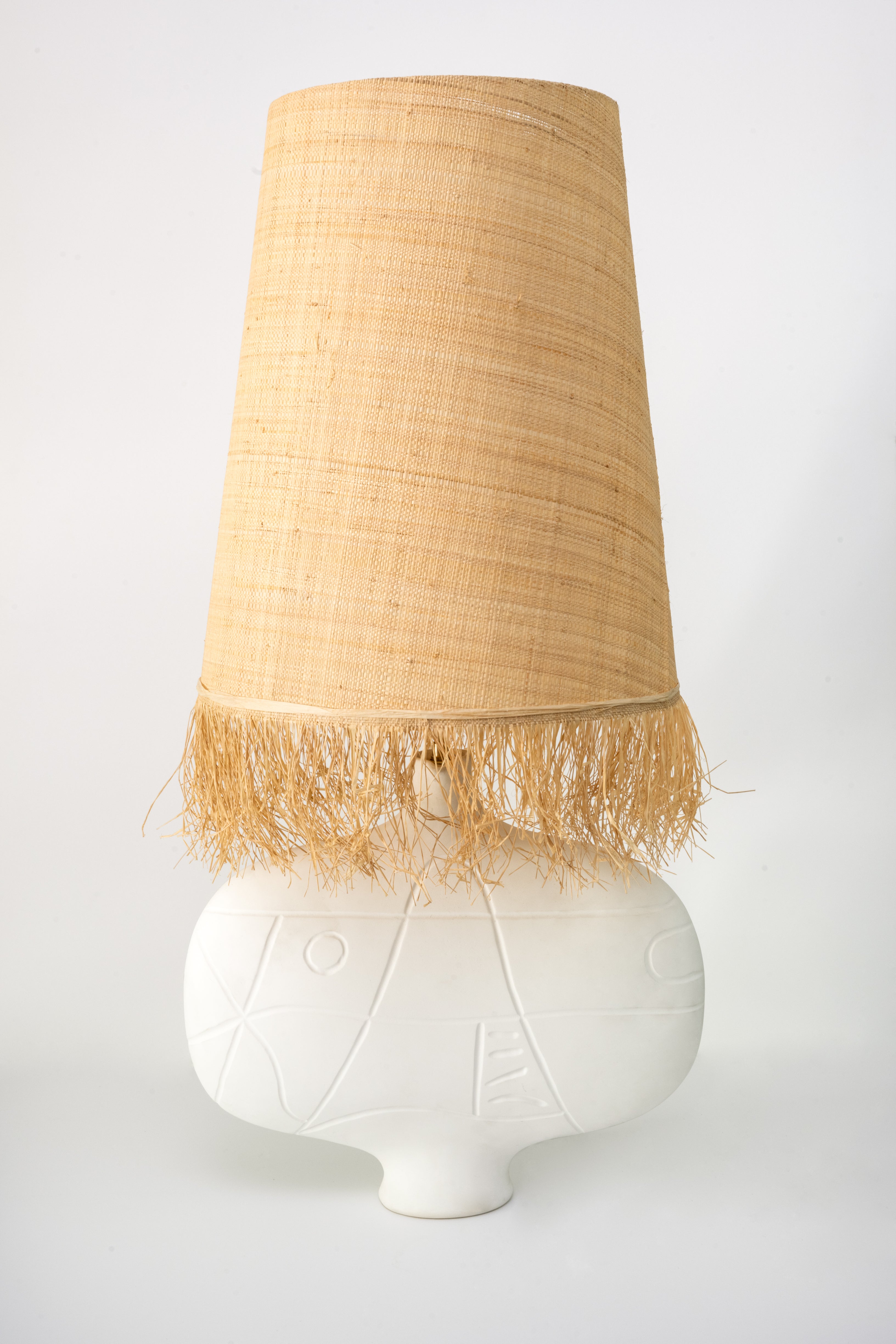 Ceramic sculptural lamp in matte white with raffia lamp shade.