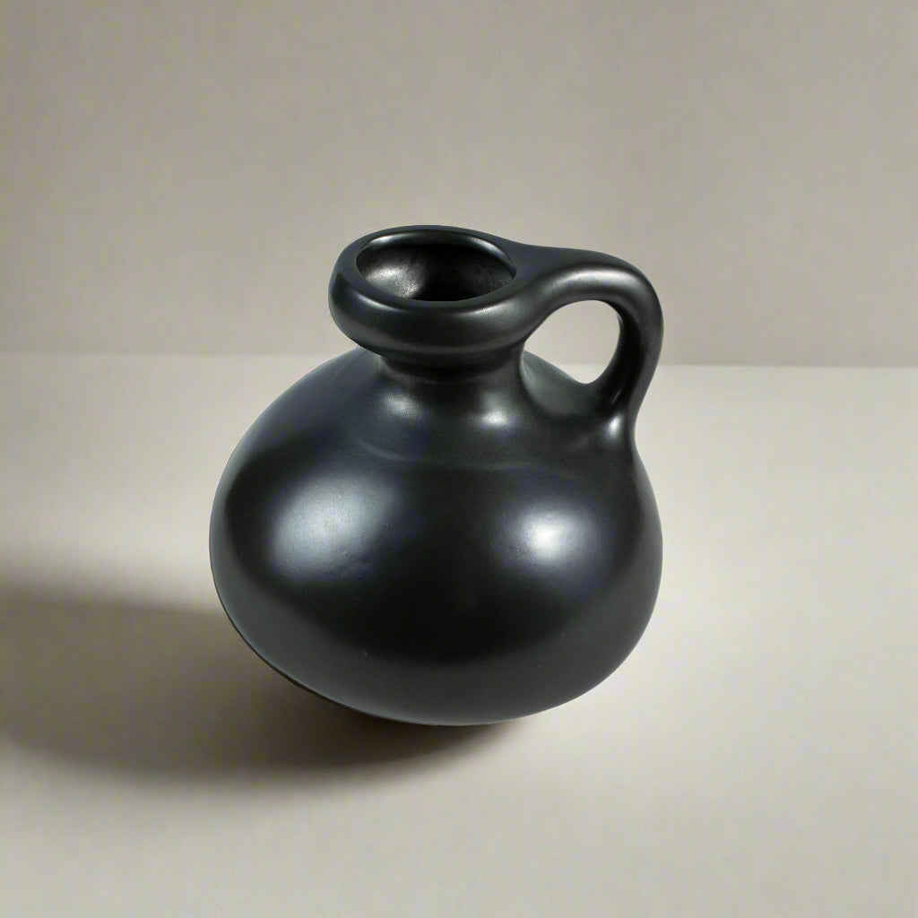 Midi-sized ceramic black glossy vase featuring uniquely shaped handle. Each piece is hand-painted and one-of-a-kind.