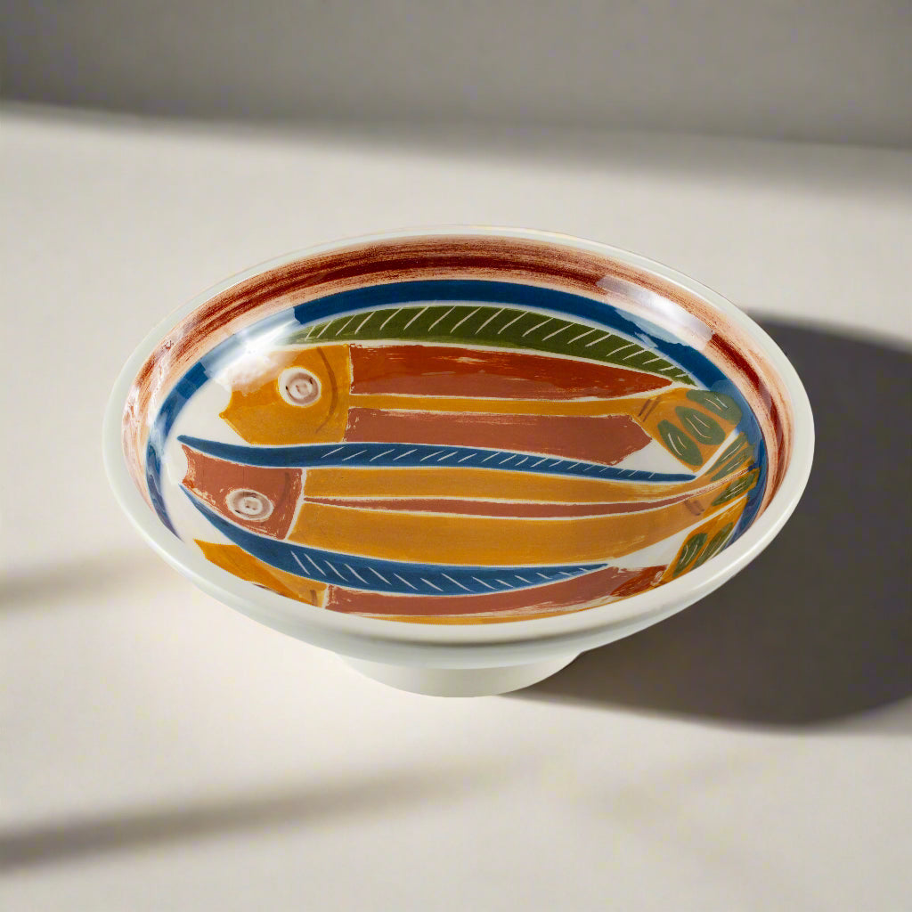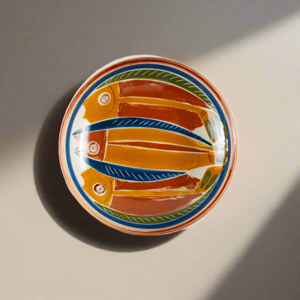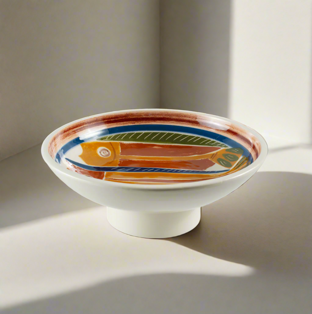 A ceramic centerpiece featuring uniquely shaped and colored fish, with the artist's hand signature at the bottom. Each piece is hand-painted and one of a kind.