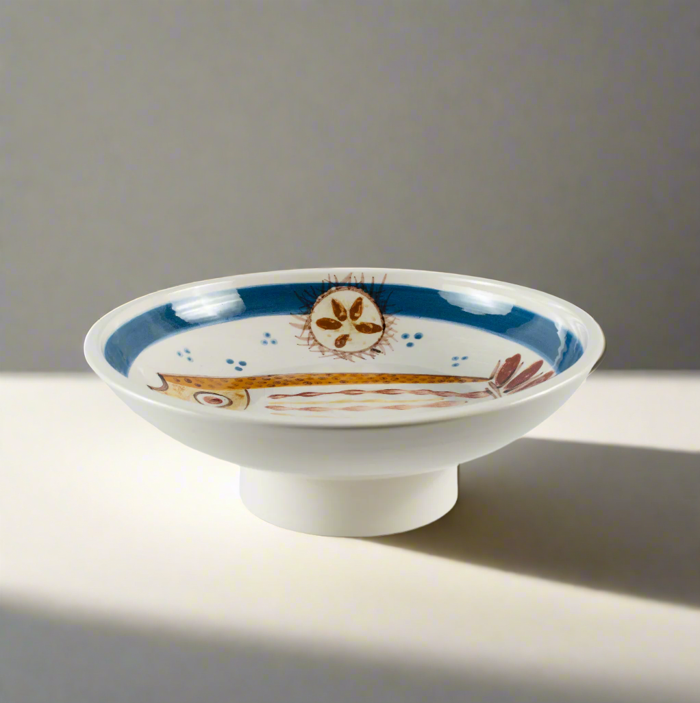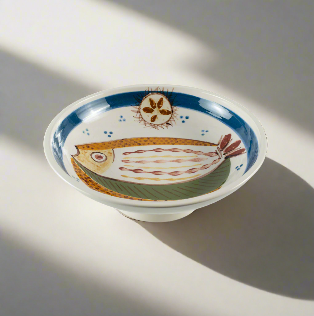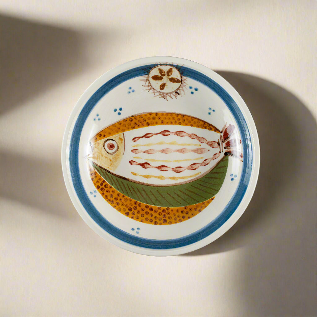 A ceramic centerpiece featuring uniquely shaped and colored fish, with the artist's hand signature at the bottom. Each piece is hand-painted and one of a kind.