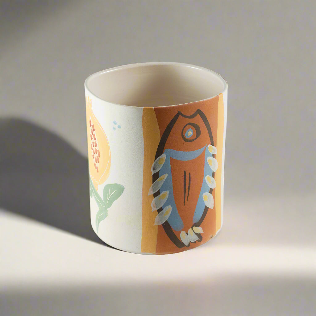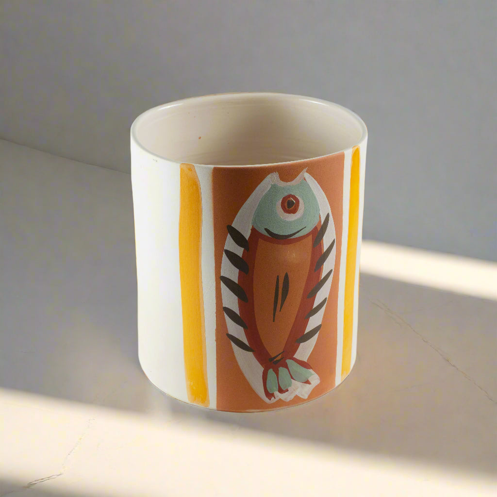 Versatile ceramic bin, featuring uniquely shaped and colored fish on two sides and a flower on the other side . Each piece is hand-painted and one-of-a-kind.