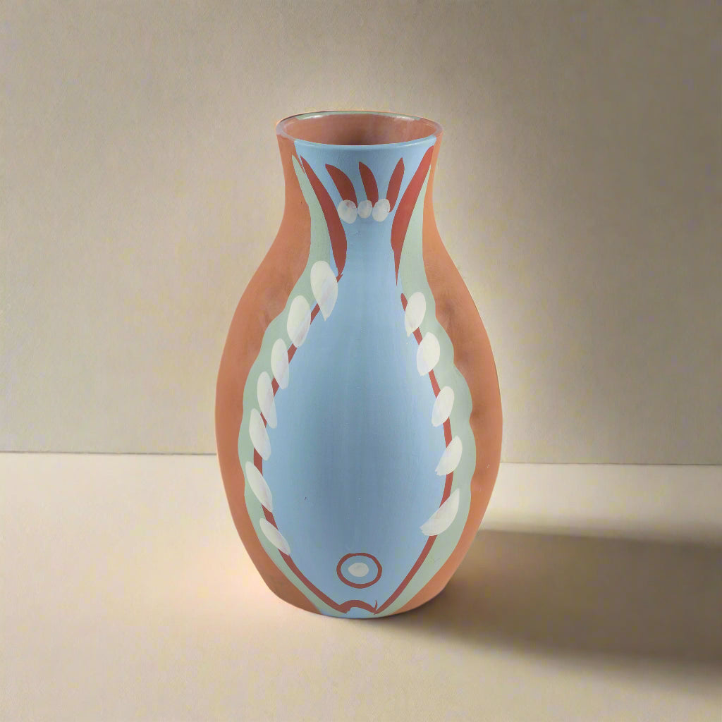 Medium-sized ceramic double-faced vase in terracotta, featuring uniquely shaped and colored fish on both the front and back. Each item is hand-painted and one of a kind.