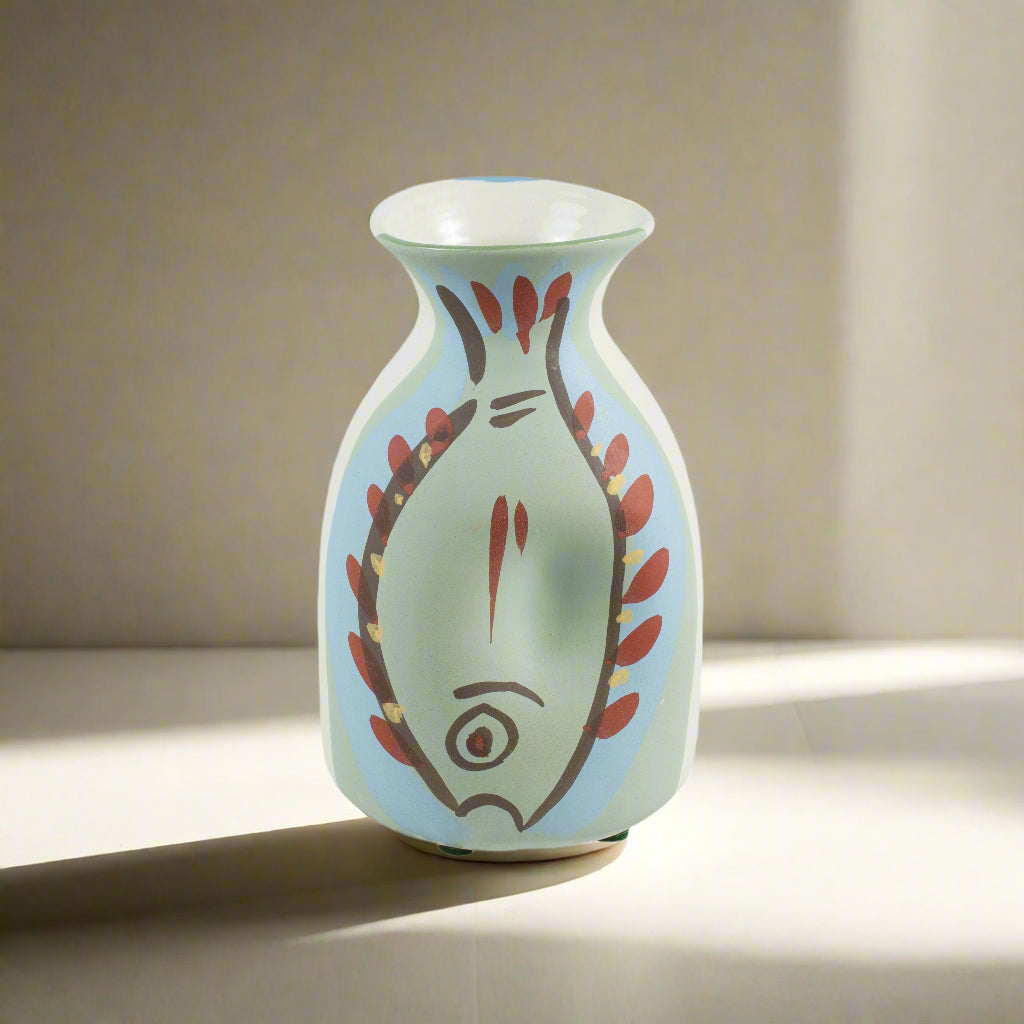 Small ceramic double-faced vase showing a blue fish on the front and a flower on the back. Each item is hand-painted and is one of a kind.