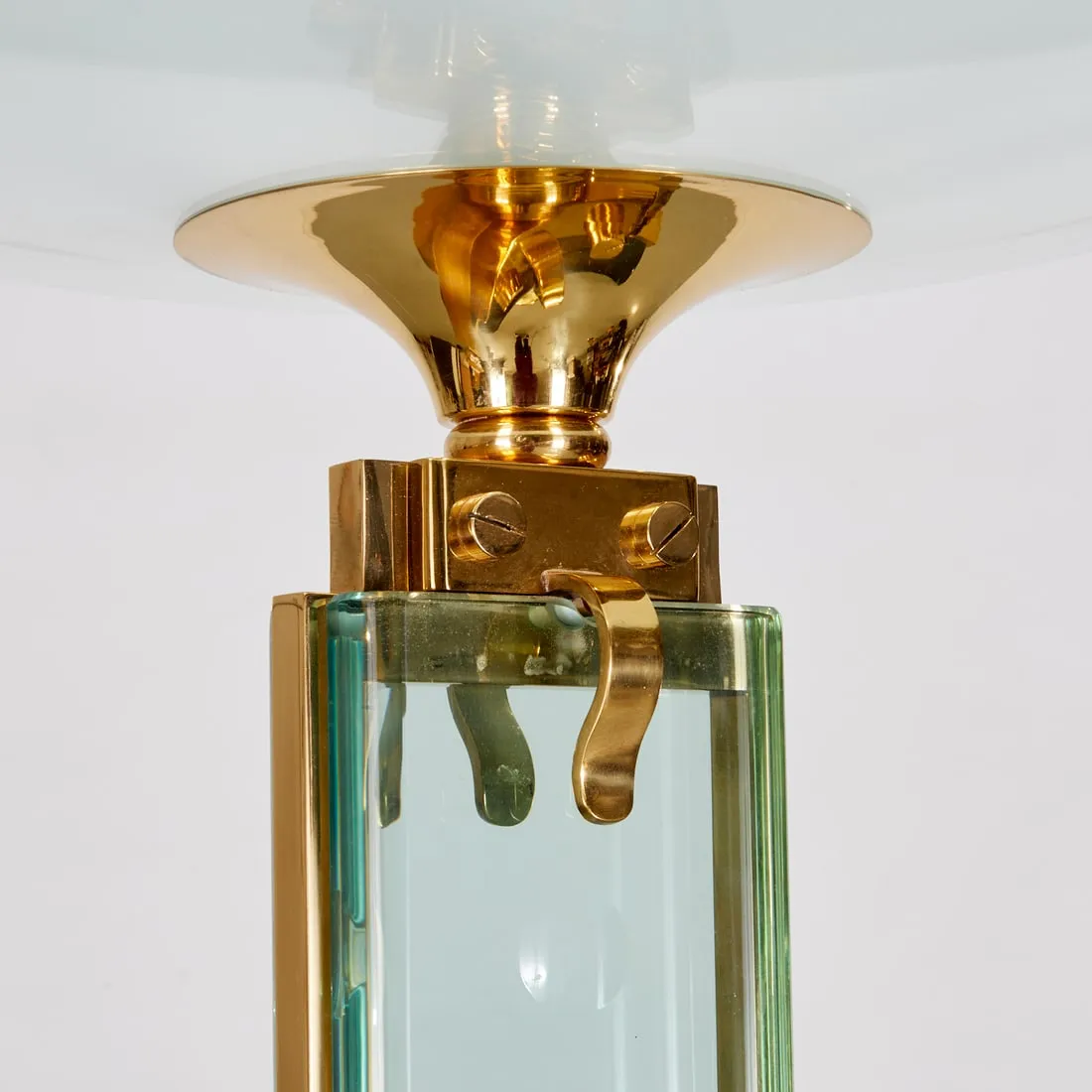 The brass-mounted double-panel glass stand is decorated with wheel-polished discs, supporting a round glass shade and six interior candelabra bulbs, on a round brass base.