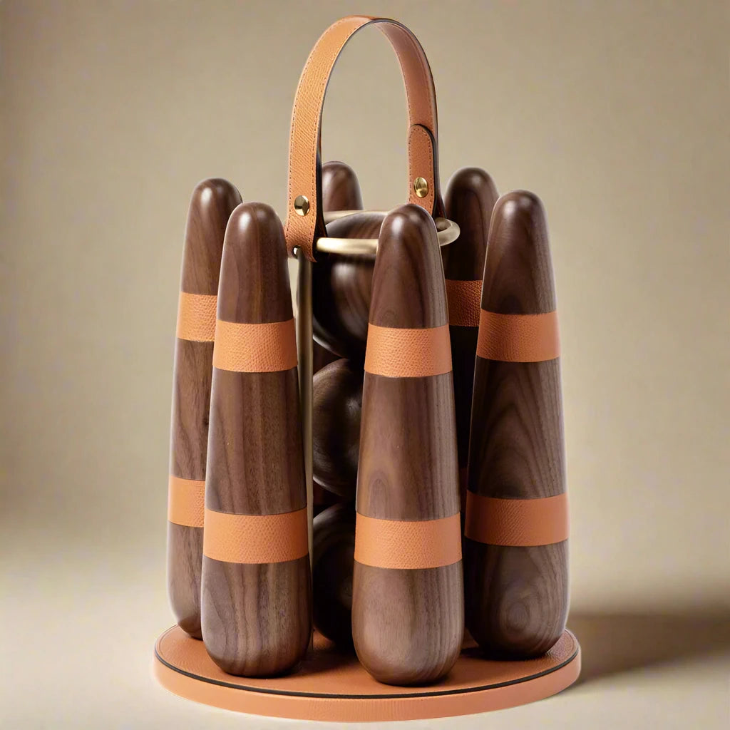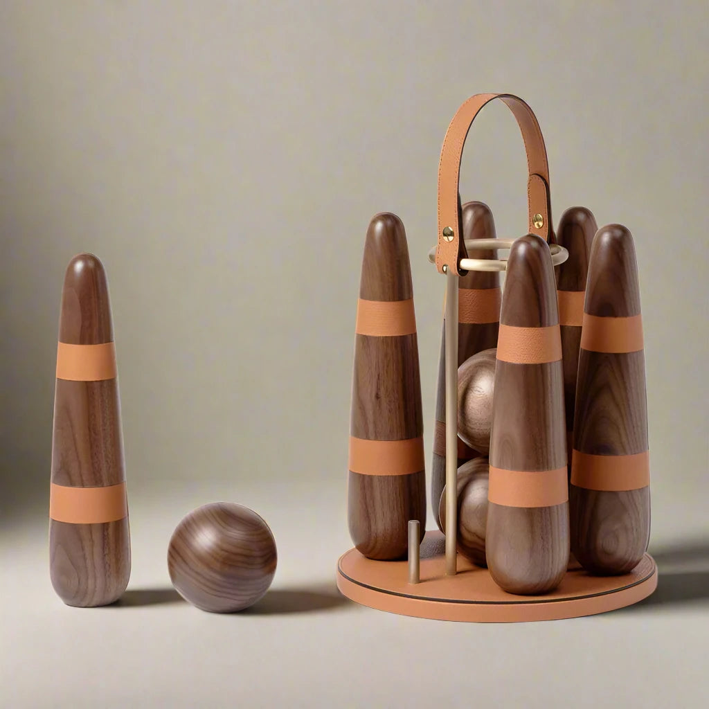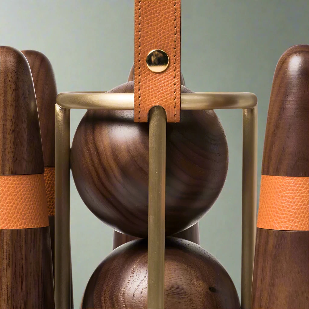 Handcrafted of Canaletto walnut, this portable bowling set includes three balls and six stylized pins with biscuit leather details.