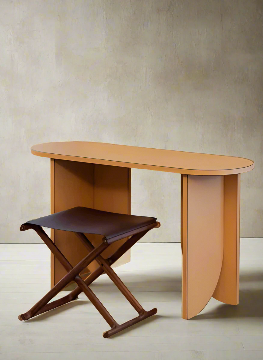This console features sleek, minimalist lines wrapped in calfskin and finished in an elegant hue of orange.