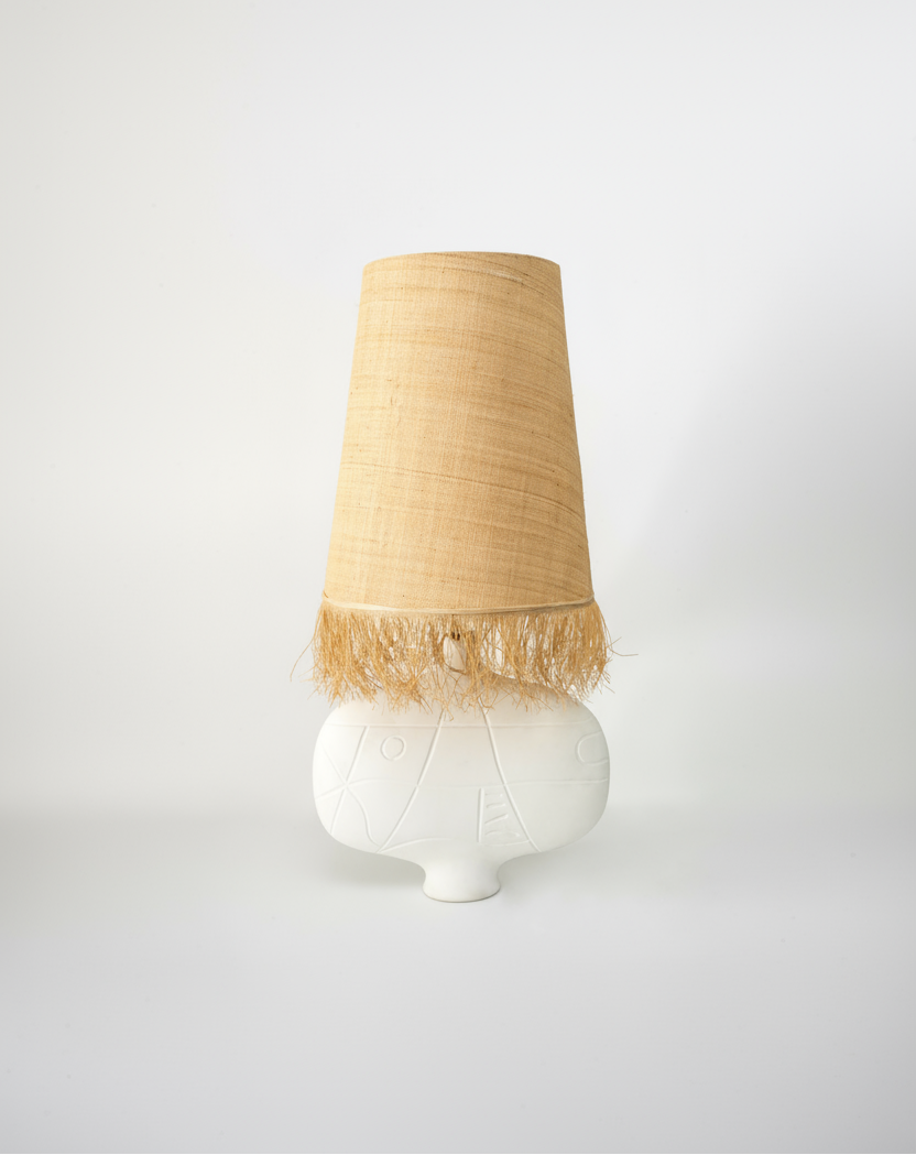 Ceramic sculptural lamp in matte white with raffia lamp shade.